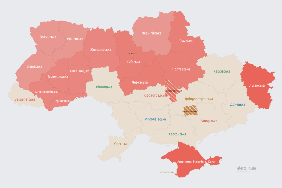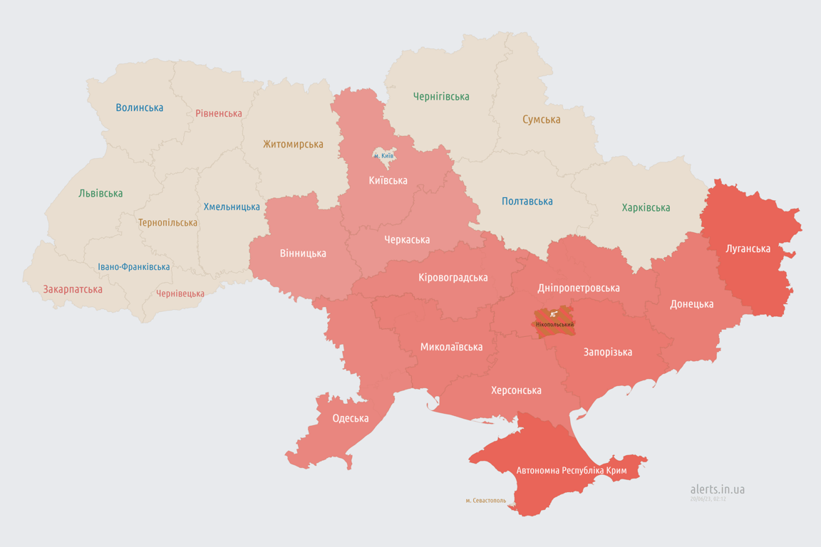 Повітряна тривога ширилась по Україні вночі, 20 червня. Також було оголошено тривогу в Київській області.