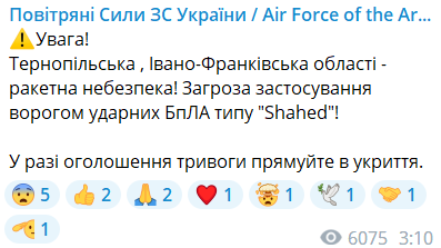 Оновлено 02:52. У Повітряних силах попереджають про ракетну небезпеку та загрозу атаки БпЛА у "червоних" областях.