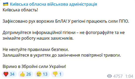 Оновлено 01:10. "Київська область! Зафіксовано рух ворожих БпЛА! У регіоні працюють сили ППО", — повідомляє Київська ОВА.