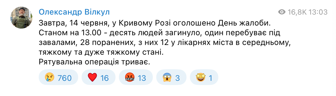 Сьогодні, 13 червня, російські окупаційні війська завдали сильного ракетного удару по Кривому Рогу. Станом на зараз кількість жертв зросла до десяти. Завтра в місті оголошено День жалоби.