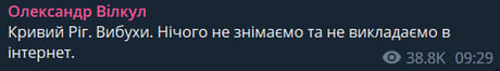 "Кривий Ріг. Вибухи. Нічого не знімаємо та не викладаємо в інтернет", — написав Вілкул.