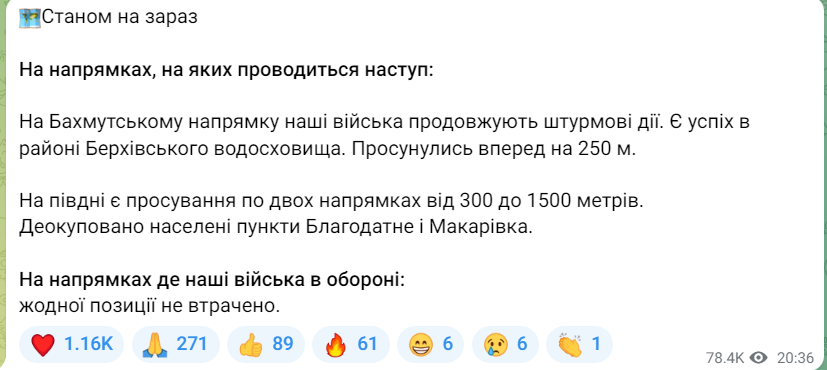 ЗСУ продовжують проводити штурмові дії на Бахмутському напрямку. Наразі відомо про ще одне звільнене село Донеччини.