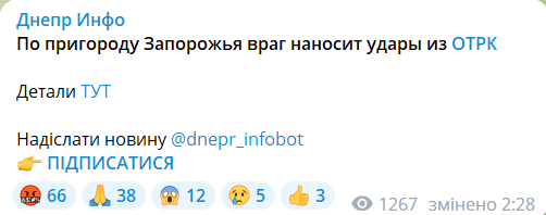 Оновлено 02:30. Є інформація, що РФ обстрілює Запоріжжя з ОТРК.