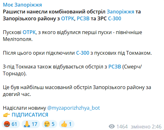 Оновлено 02:54. Місцеві пабліки попередньо повідомляють про комбінований удар по Запоріжжю з ОТРК, РСЗВ та ракетами С-300. Чекаємо на офіційну інформацію.