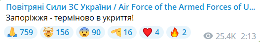 Оновлено 02:20. Повітряні сили закликають мешканців Запоріжжя спуститися в укриття.
