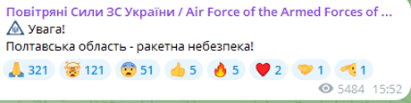 У Полтавській області оголошено повітряну тривогу. Є загроза застосування росіянами ракетного озброєння.
