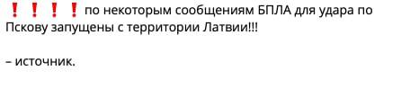 Зазначається, що на аеропорт у Пскові було здійснено атаку БпЛА. Більше того росЗМІ повідомляють, що безпілотники нібито запущені з Латвії.