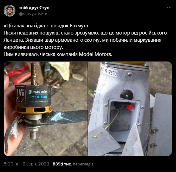 Бійці Збройних сил України серед уламків російського дрона-камікадзе "Ланцет" знайшли деталі чеського виробництва. Їх виготовила місцева компанія "Model Motors".