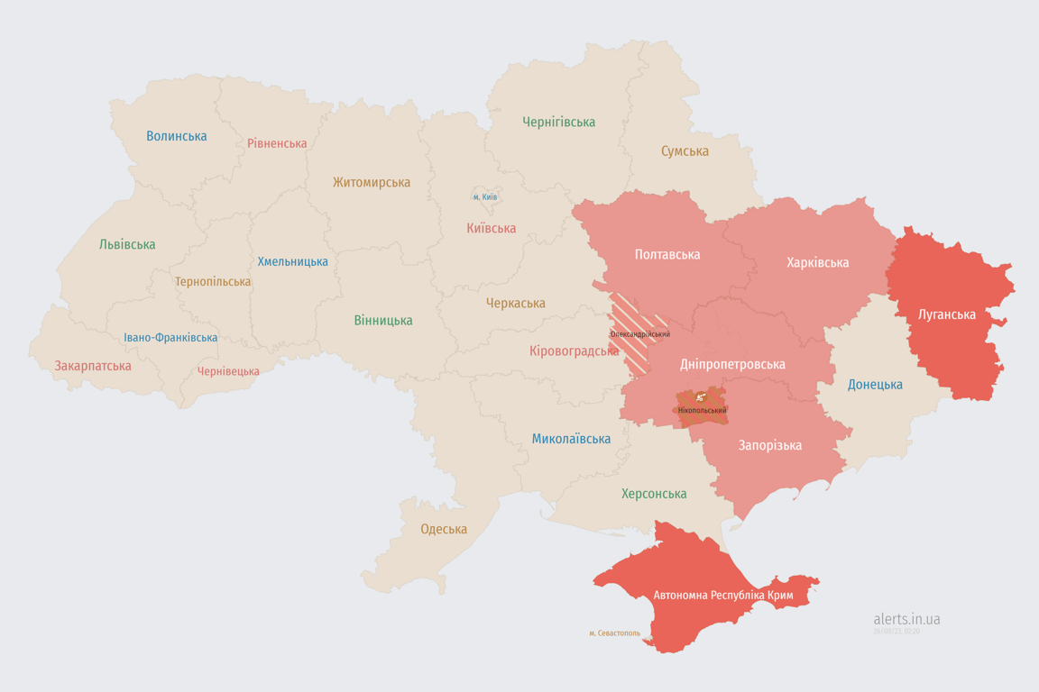 Оновлено 02:20. Також в Україні оголосили повітряну тривогу в чотирьох областях — Полтавській, Харківській, Дніпропетровській та Запорізькій. А також "червоні" традиційно Луганщина та Крим.