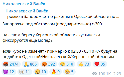 Оновлено 02:26. Моніторинговий канал "Николаевский Ванек" повідомляє про обстріл області. Також попереджають про наближення БпЛА.