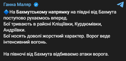 "Україна поступово просувається на південь від Бахмута, тривають бої в Кліщіївці, Курдюмівці та Андріївці — трьох селах на південь від міста", — повідомила заступник міністра оборони України Ганна Маляр у Telegram та в етері Національного телемарафону "Єдині новини".