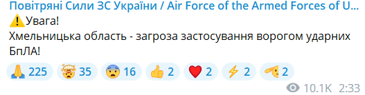 Оновлено 02:39. Повітряні сили повідомляють про загрозу БпЛА в Хмельницькій області.