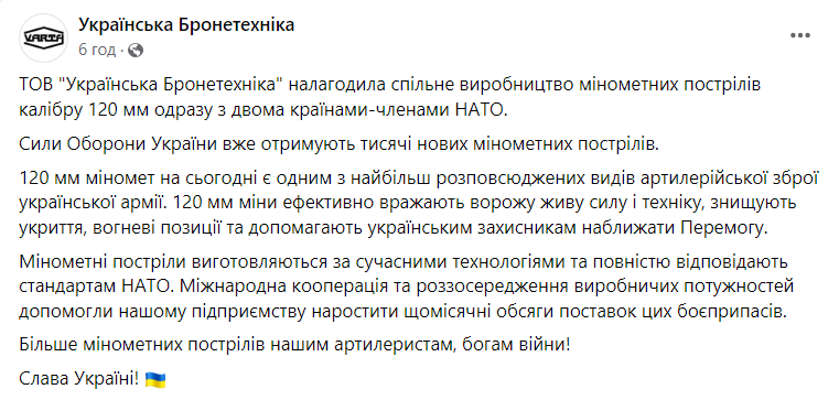Товариство з обмеженою відповідальністю "Українська Бронетехніка" спільно з двома країнами-членкинями НАТО вироблятиме мінометні постріли 120 мм калібру. Так, ЗСУ вже отримують тисячі нових мінометних мін.