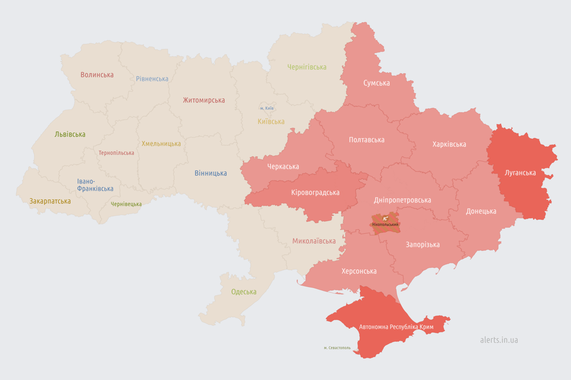 Оновлено 02:50. Знову повідомляють про повітряну тривогу в низці областей України: Харківській, Дніпропетровській, Полтавській, Миколаївській, Донецькій, Запорізькій, Сумській та Херсонській.
