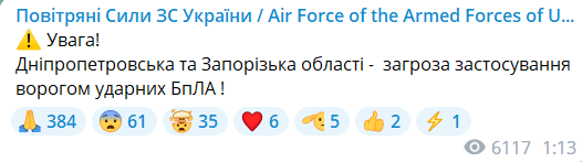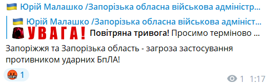 Також про загрозу застосування ударних БпЛА в Запоріжжі та області повідомляє також і очільник Запорізької ОВА.