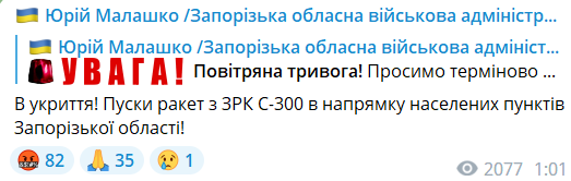 Оновлено 01:09. "Пуски ракет з ЗРК С-300 в напрямку населених пунктів Запорізької області!" — попереджає очільник Запорізької ОВА Юрій Малашко.