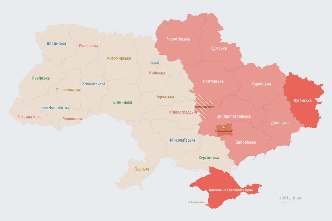 Ввечері, 13 липня, Україною почала ширитися повітряна тривога. Наразі "почервоніла" значна частина областей.
