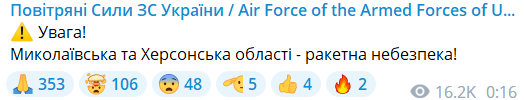 Оновлено 00:19. Повітряні сили повідомляють про ракетну небезпеку в Миколаївській та Херсонській областях.