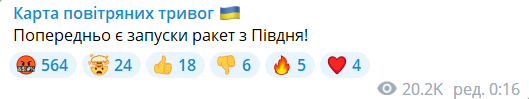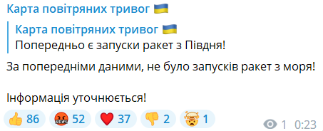Водночас моніторингові канали повідомляють про пуски "Калібрів" із Півдня.