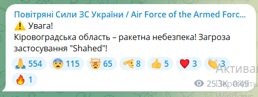 Оновлено 01:05. Повітряні сили повідомляють про ракетну небезпеку в Кіровоградській області.