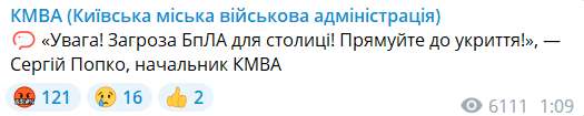 Оновлено 01:18. Очільник КМВА Сергій Попко також заявив про загрозу БпЛА для столиці. Він закликає не нехтувати безпекою та йти в укриття.