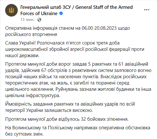 Звіт Генштабу ЗСУ на ранок 20 серпня