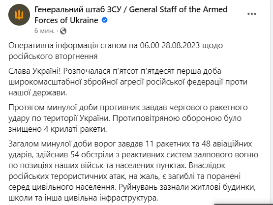 Звіт Генштабу ЗСУ на ранок 28 серпня