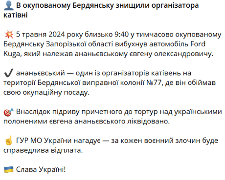 "5 травня 2024 року близько 09:40 у тимчасово окупованому Бердянську Запорізької області вибухнув автомобіль Ford Kuga, який належав Ананевському Євгену Олександровичу", — йдеться у повідомленні.