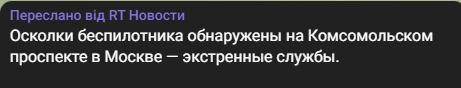У соціальних мережах російські ЗМІ демонструють будівлю на Комсомольському проспекті столиці, неподалік Міністерства оборони. Біля нього знайдені уламки нібито "українського дрона".