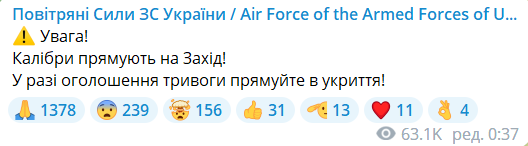 Також Повітряні сили повідомляють ракети в напрямку Заходу.