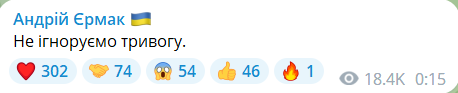 Оновлено 00:22. Андрій Єрмак закликає не ігнорувати повітряну тривогу.