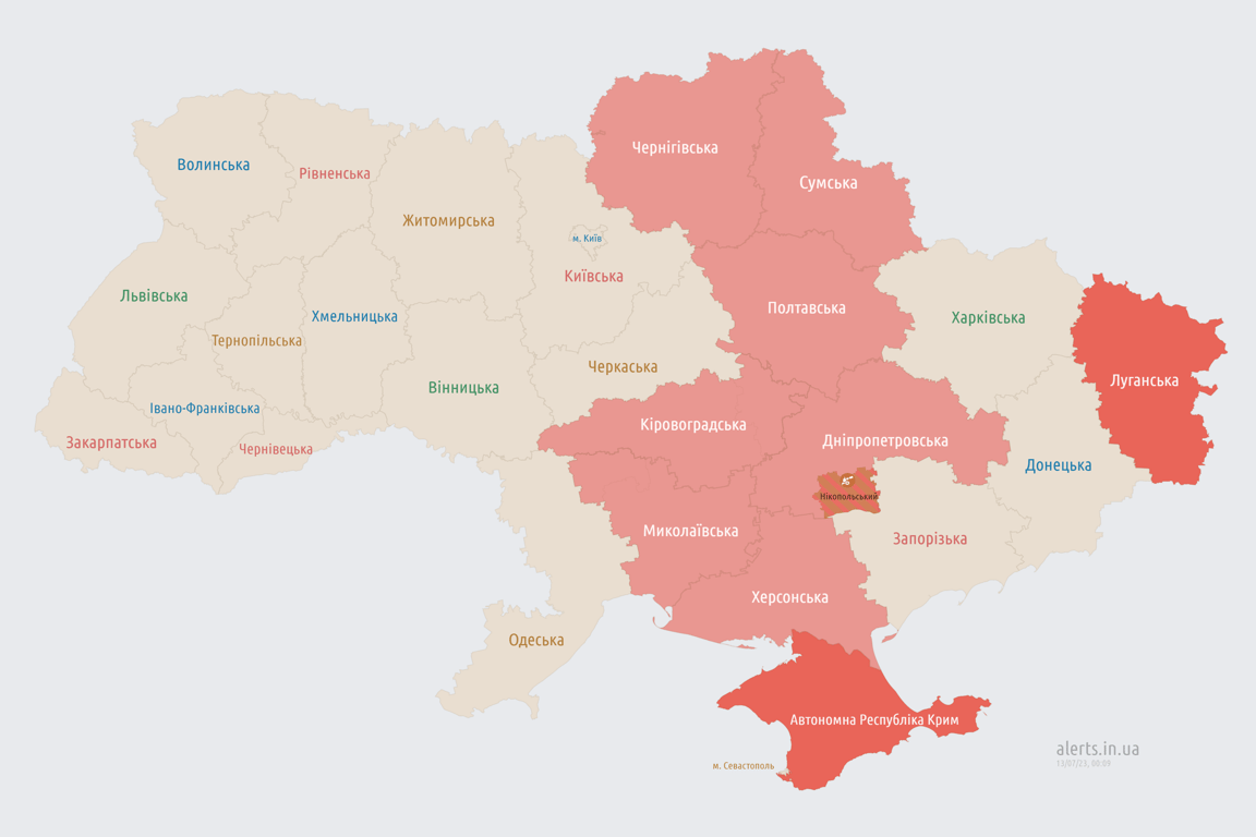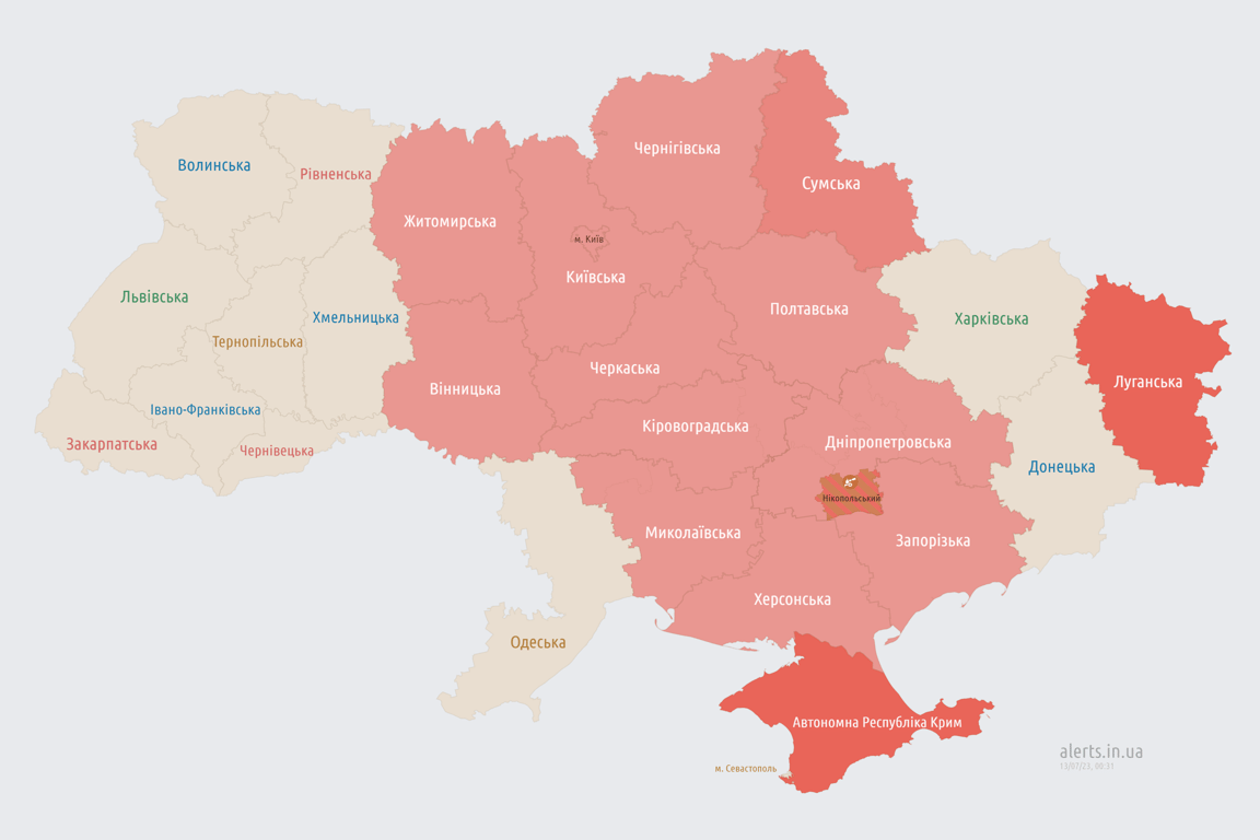 Вночі, 13 липня, в Україні оголошено повітряну тривогу. Наразі "почервоніли" майже всі області, є загроза атаки "Калібрів".