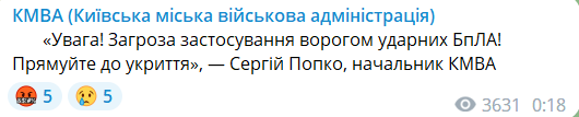 У КМВА також попереджають про загрозу БпЛА та закликають іти в укриття.