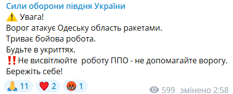 "Ворог атакує Одеську область ракетами морського базування", — повідомляє ОК "Південь".