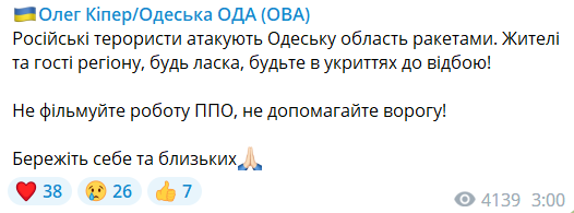 Оновлено 03:05. "Російські терористи атакують Одеську область ракетами. Жителі та гості регіону, будь ласка, будьте в укриттях до відбою", — зазначили в ОВА.