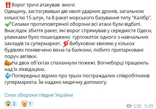 "Силами протиповітряної оборони всі атаки були відбиті. Внаслідок збиття ракет, які ворог спрямував у середмістя Одеси, уламками було пошкоджено гуртожиток одного з навчальних закладів та супермаркет. Вибуховою хвилею у кількох будівлях понівечено вікна та балкони, побито припарковані поруч автівки", — йдеться в повідомленні.