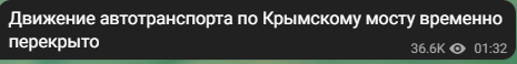 Російські ЗМІ також повідомляють, що рух автотранспорту по Кримському мосту перекрито.