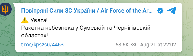 Пізніше Повітряні сили зазначили, що триває ракетна небезпека для Сумської та Чернігівської областей.