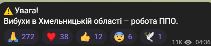 Моніторингові канали повідомляють про вибухи у Хмельницькій області. Передбачають, що це працює наша Повітряна оборона.