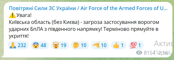 Оновлено 02:19. Є загроза застосування ударних БпЛА в Київській області та Києві.