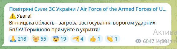 Оновлено 01:32. Повітряні сили повідомляють про загрозу застосування безпілотників у Вінницькій області.