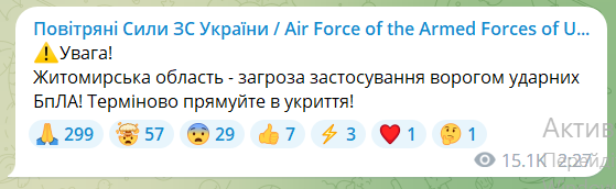 Оновлено 02:31. "Житомирська область — загроза застосування ворогом ударних БпЛА! Терміново прямуйте в укриття!" — повідомили Повітряні сили.