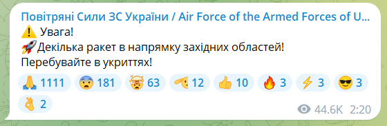 Оновлено 02:21. Повітряні сили попереджають про ракети в напрямку західних областей.