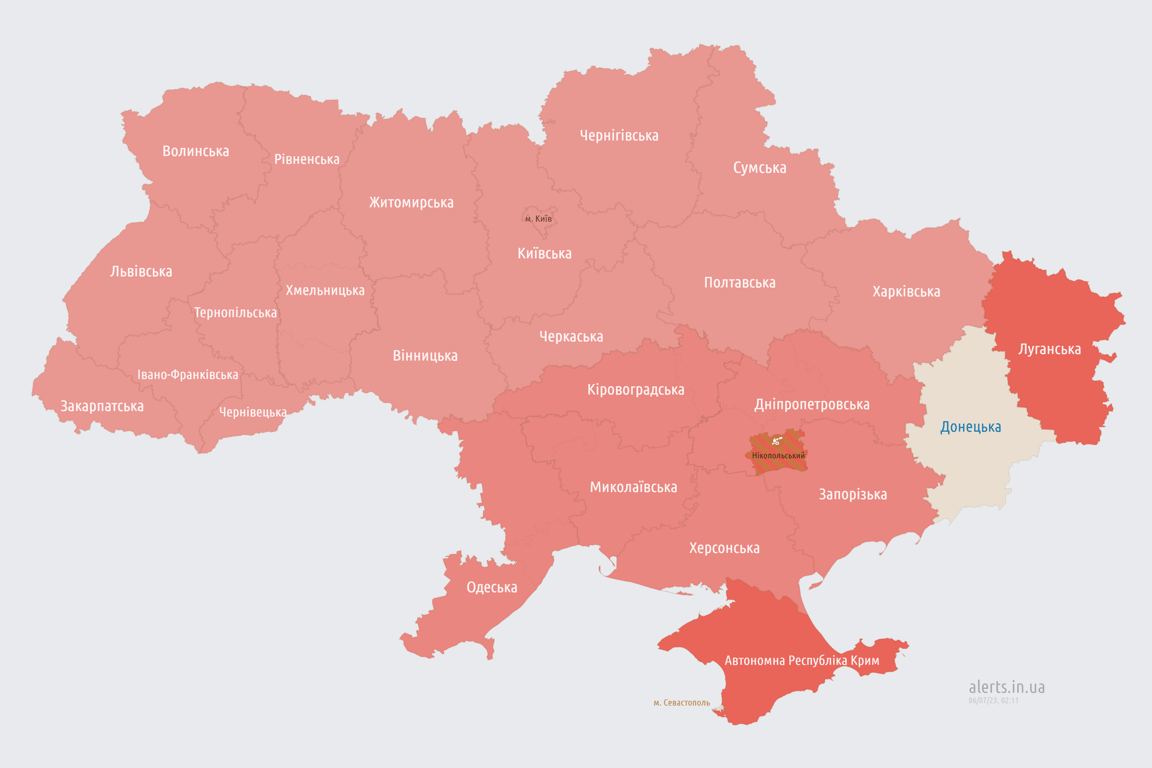 Вночі, 6 липня, в Україні оголошено масштабну повітряну тривогу. Є загроза атаки ворожих ракет та безпілотників.