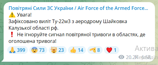 Оновлено 07:06. Повітряні сили повідомляють про виліт Ту-22м3 з аеродрому Шайковка в Росії.