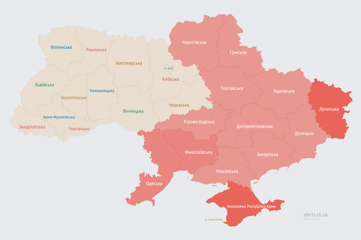 Зранку 2 липня в Україні оголошено масштабну повітряну тривогу. "Почервоніла" значна частина областей.