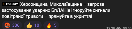 Військові попереджають жителів Херсонської та Миколаївської областей про загрозу застосування ударних дронів.