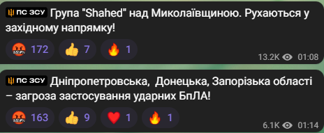 Також ворожі "Шахеди" рухаються у західному напрямку.