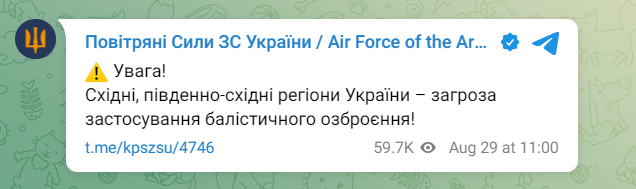 "Увага! Східні, південно-східні регіони України — загроза застосування балістичного озброєння!", — зазначили у повідомленні.