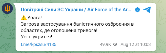"Увага! Загроза застосування балістичного озброєння в областях, де оголошена тривога! Усі в укриття!", — йдеться у повідомленні.